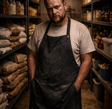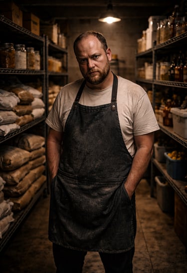 Shelves stretch into the shadows, stacked with flour, sugar, and unlabeled jars you don’t remember seeing in the front. The light overhead hums, weak and yellow, leaving the corners of the room unfinished.